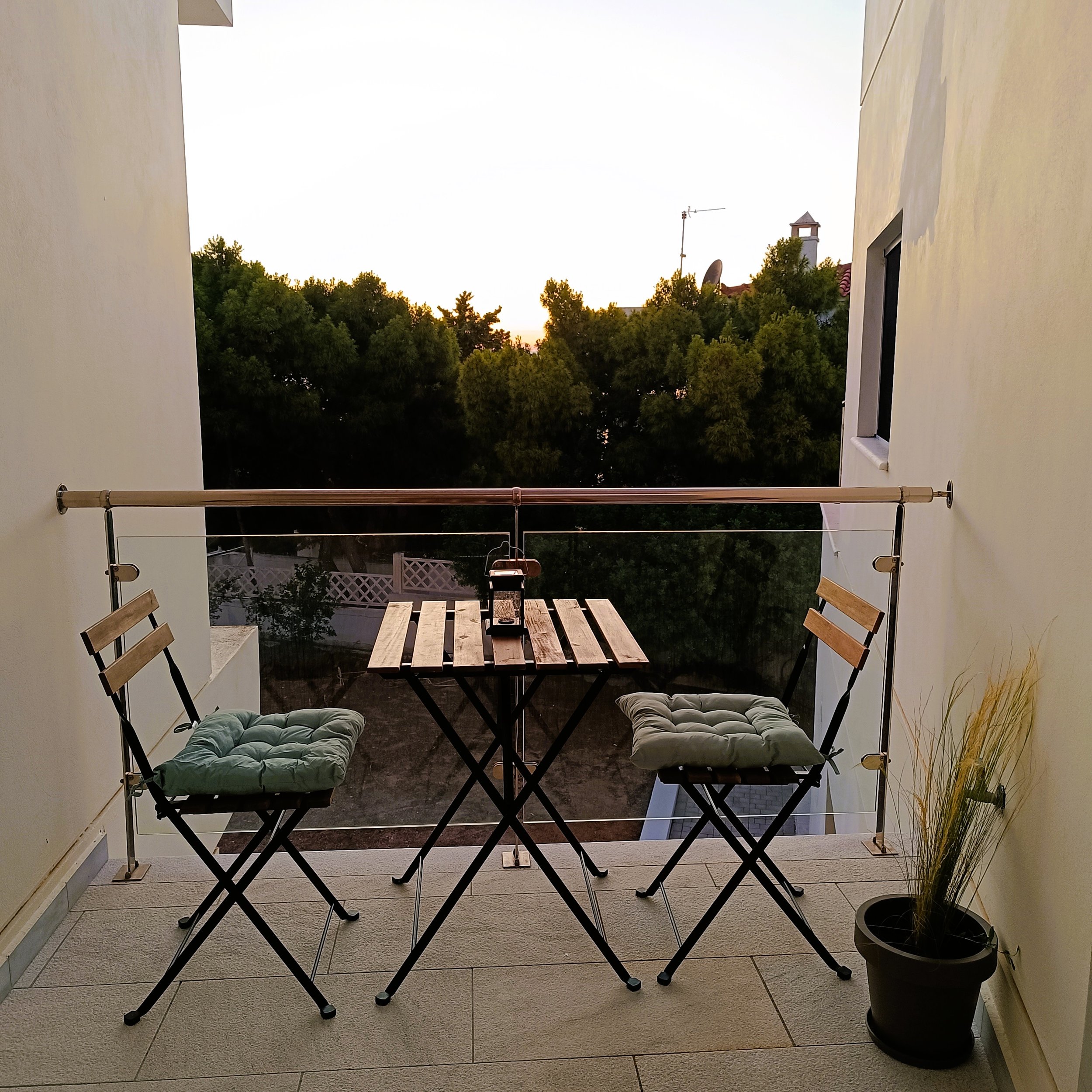Designed with a love for light and space, Schinos features a soft white palette, large windows, and a glass-door balcony overlooking lush pine trees and the sea beyond. The room is tastefully furnished with natural materials, including a wooden open wardrobe and light touches of coastal decor.